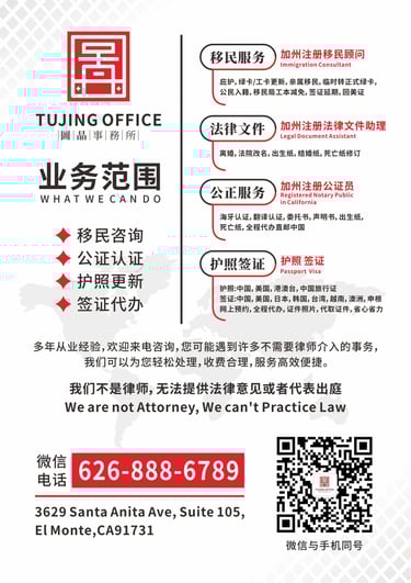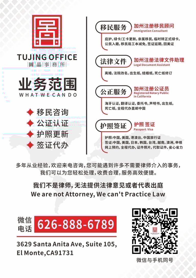 深耕洛杉矶华人社区,是持有加州注册移民顾问及法律文件助理双重资质的一站式专业服务机构。我们精通各类亲属移民、绿卡入籍、海牙认证、全球签证及中、美、港、台护照代办,并特色提供从婚礼举办到颁发结婚证的全流程服务。秉承高效与诚信的理念,我们致力于以合理的价格为您免去繁琐的文书流程与奔波之苦。请注意,我们非律师机构,不提供法律建议,专注于确保您的每一份申请材料准确无误。